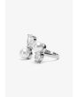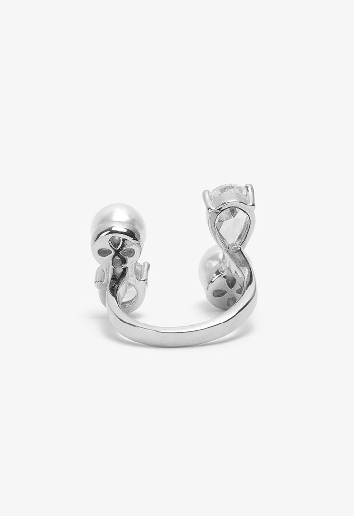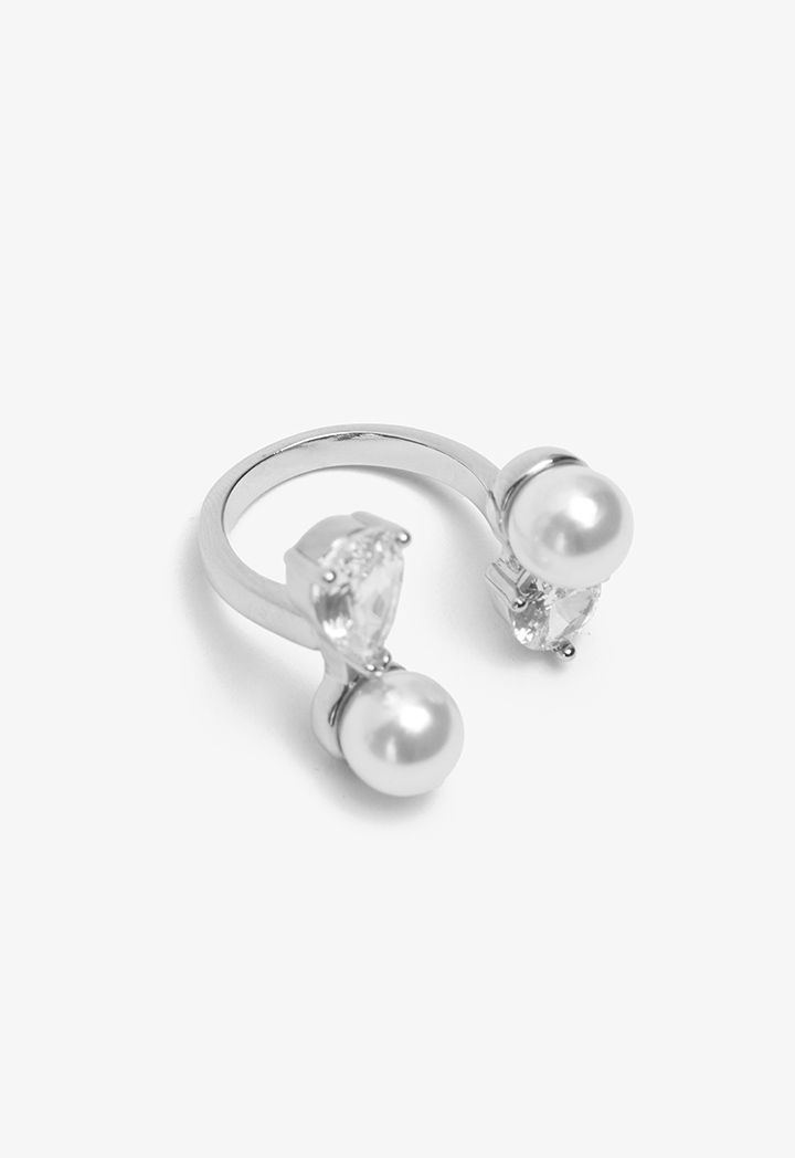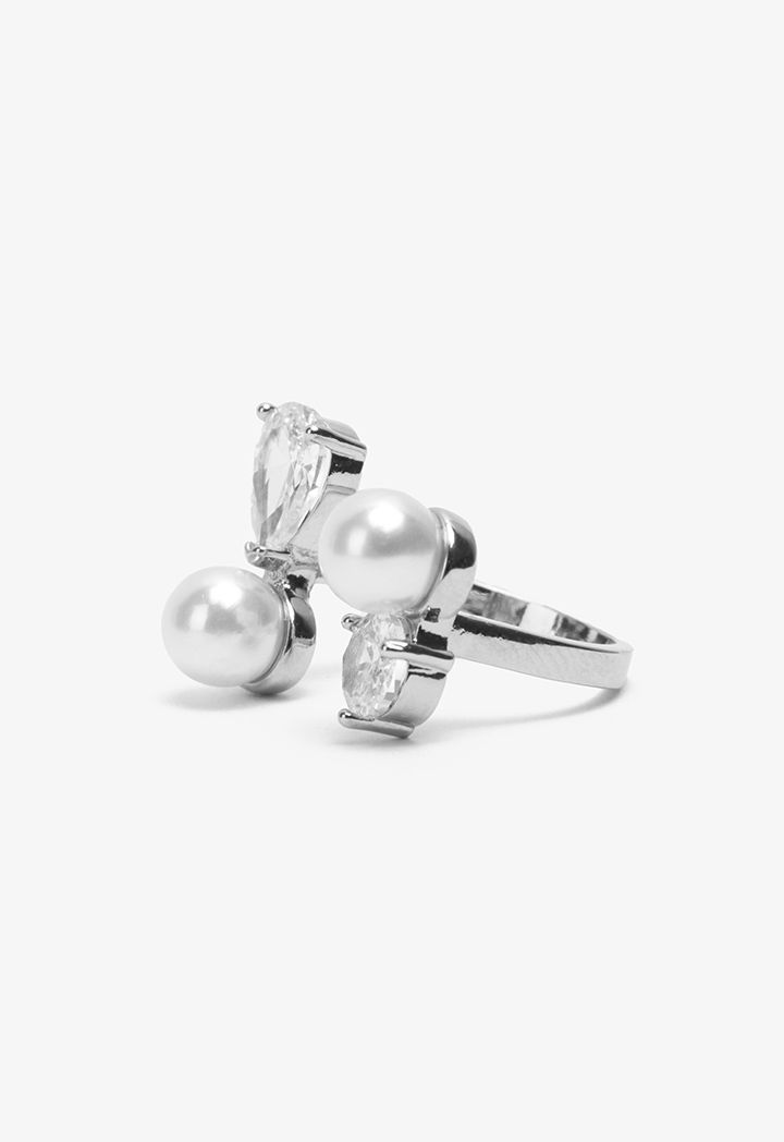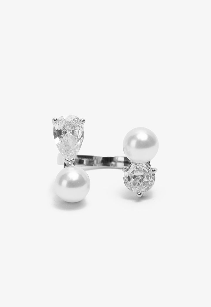 A modern wrap ring that features a crystal and faux pearls embellished design.